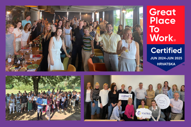 Viatris Hrvatska nagrađen je certifikatom Great Place to Work®. Ovo postignuće potvrđuje Viatrisove napore u stvaranju pozitivne radne kulture, promicanju dobrobiti zaposlenika i pružanju prilika za razvoj karijere. Certifikacija potvrđuje Viatrisovu predanost poticanju angažiranog i inkluzivnog radnog okruženja u kojem se zaposlenici osjećaju cijenjeno i podržano.